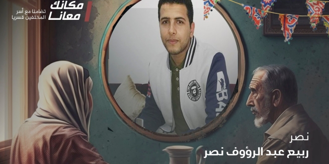 وعبر وسم #مكانك_معانا جددت حملة أوقفوا الاختفاء القسري المطالبة برفع الظلم الواقع على الشاب  "نصر ربيع عبد الرؤوف نصر" الذي يقضي رمضانه السادس قيد الإختفاء القسري منذ أن تم اعتقاله بتاريخ  13فبراير2018 بعد القبض عليه من الصيدلية التي يعمل بها بحي مدينة نصر في القاهرة.