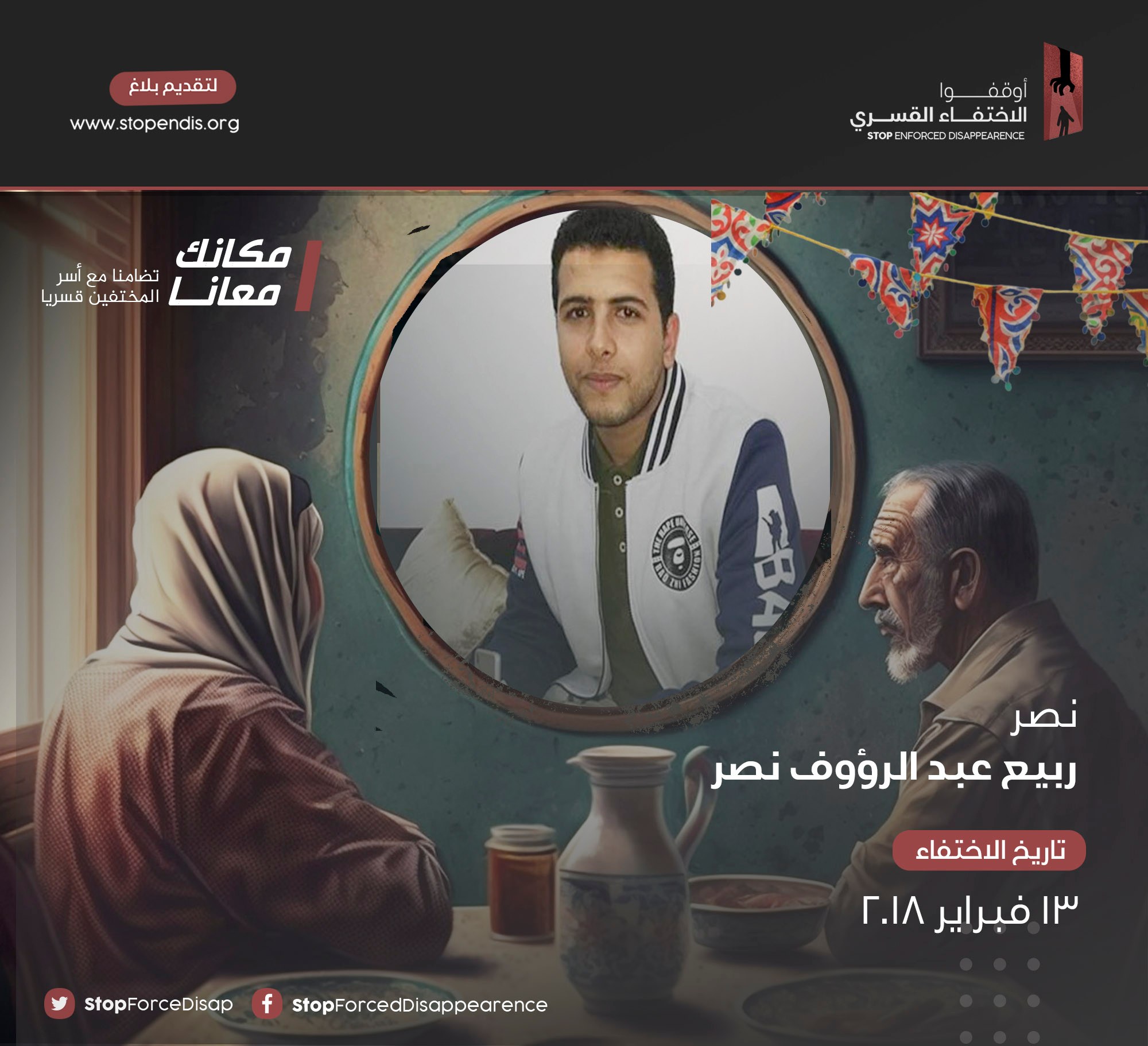 وعبر وسم #مكانك_معانا جددت حملة أوقفوا الاختفاء القسري المطالبة برفع الظلم الواقع على الشاب  "نصر ربيع عبد الرؤوف نصر" الذي يقضي رمضانه السادس قيد الإختفاء القسري منذ أن تم اعتقاله بتاريخ  13فبراير2018 بعد القبض عليه من الصيدلية التي يعمل بها بحي مدينة نصر في القاهرة.
