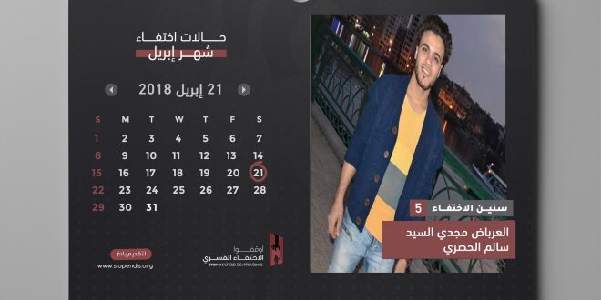 بالتزامن مع مرور 5 سنوات على جريمة إخفاء الشاب “عبدالرحمن أحمد محمد عبده ” من “كفر البطيخ” بدمياط، منذ اعتقاله بتاريخ 21 إبريل 2018 برفقة أحد أصدقائه من أحد شوارع دمياط، جددت حملة أقفوا الاختفاء القسري المطالبة بالكشف عن مكان احتجازه القسري ورفع الظلم الواقع عليه.