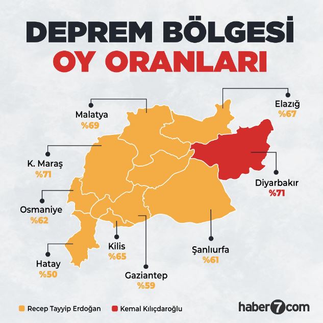 ووفقا للخريطة الأولية، فإن “تحالف الجمهور” الذي شكله العدالة والتنمية ورئيسه الطيب أردوغان فاز في 10 ولايات من أصل 11 ضربها الزلزال المدمر والذي مركزه كهرمان مرعش.