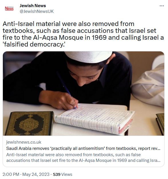 قال تقرير لموقع Jewish News العبري: إن “الحكومة السعودية أزالت كل المواد التي تشوه صورة إسرائيل من الكتب المدرسية، حيث حذفت الآيات القرآنية والأحاديث النبوية التي تتهم اليهود بالتآمر ضد الإسلام”.