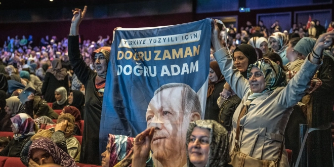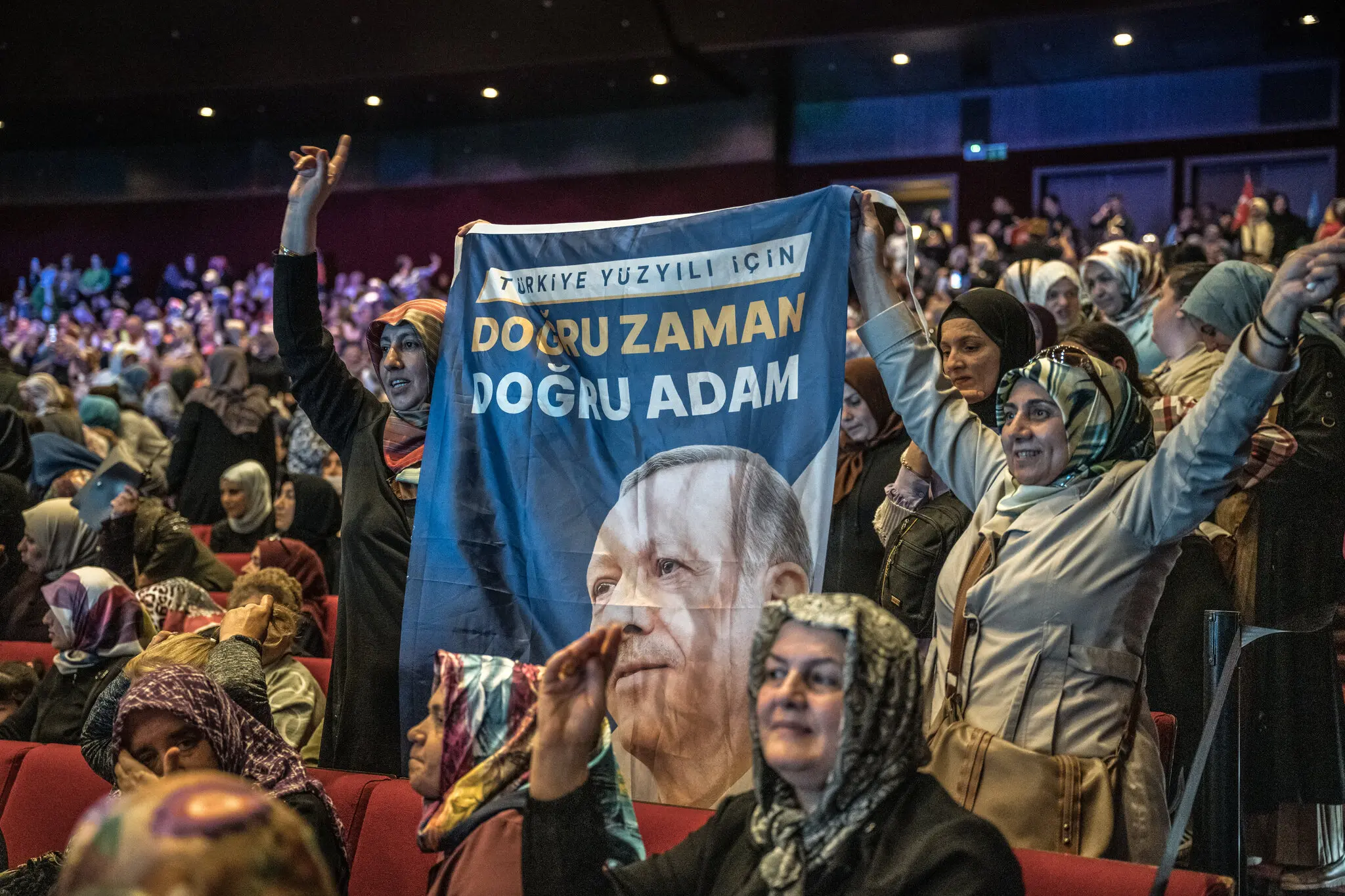 وظهر التواصل بين أردوغان وأنصاره عبر قاعة مؤتمرات في اسطنبول خلال تجمع نسائي قبل يومين من جولة الإعادة في 28 مايو. واحتشدت آلاف النساء، بعضهن مع أطفال رضع أو أطفال، في القاعة، ووصفقن ولوحن بأذرعهن لأناشيد الحملة الانتخابية ورفعن مصابيح هواتفهن المحمولة للترحيب به على خشبة المسرح.