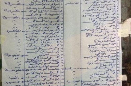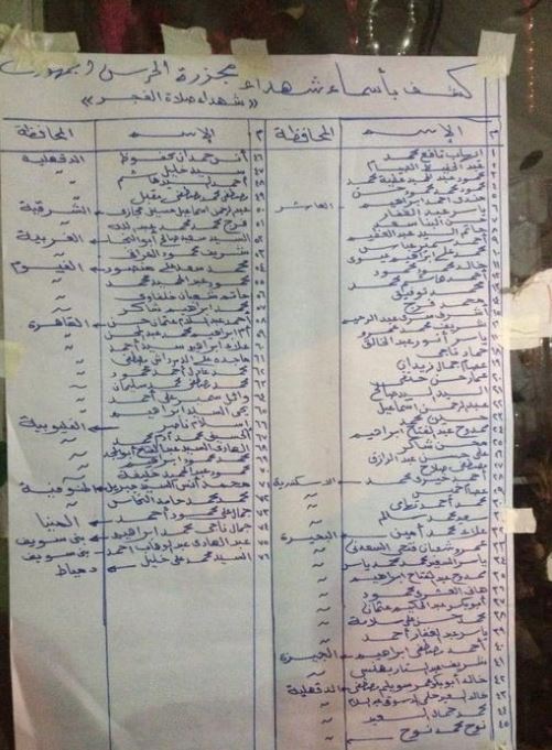 وانتهز حساب "غراب مغرد" على "فيسبوك" أن يعلن قائمة بشهداء #أبو_المطامير في #موقعة_الحرس.. #مجزرة_الساجدين.. #مذبحة_الحرس_الجمهوري
