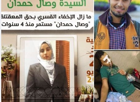 أكدت مؤسسة جوار الحقوقية على استمرار جريمة  الإخفاء القسري بحق السيدة “وصال حمدان” منذ 4 سنوات بعدما تم اعتقالها من قبل قوات أمن الانقلاب بالجيزة يوم 21 يونيو 2019 أثناء توجهها لمدينة السادس من أكتوبر.