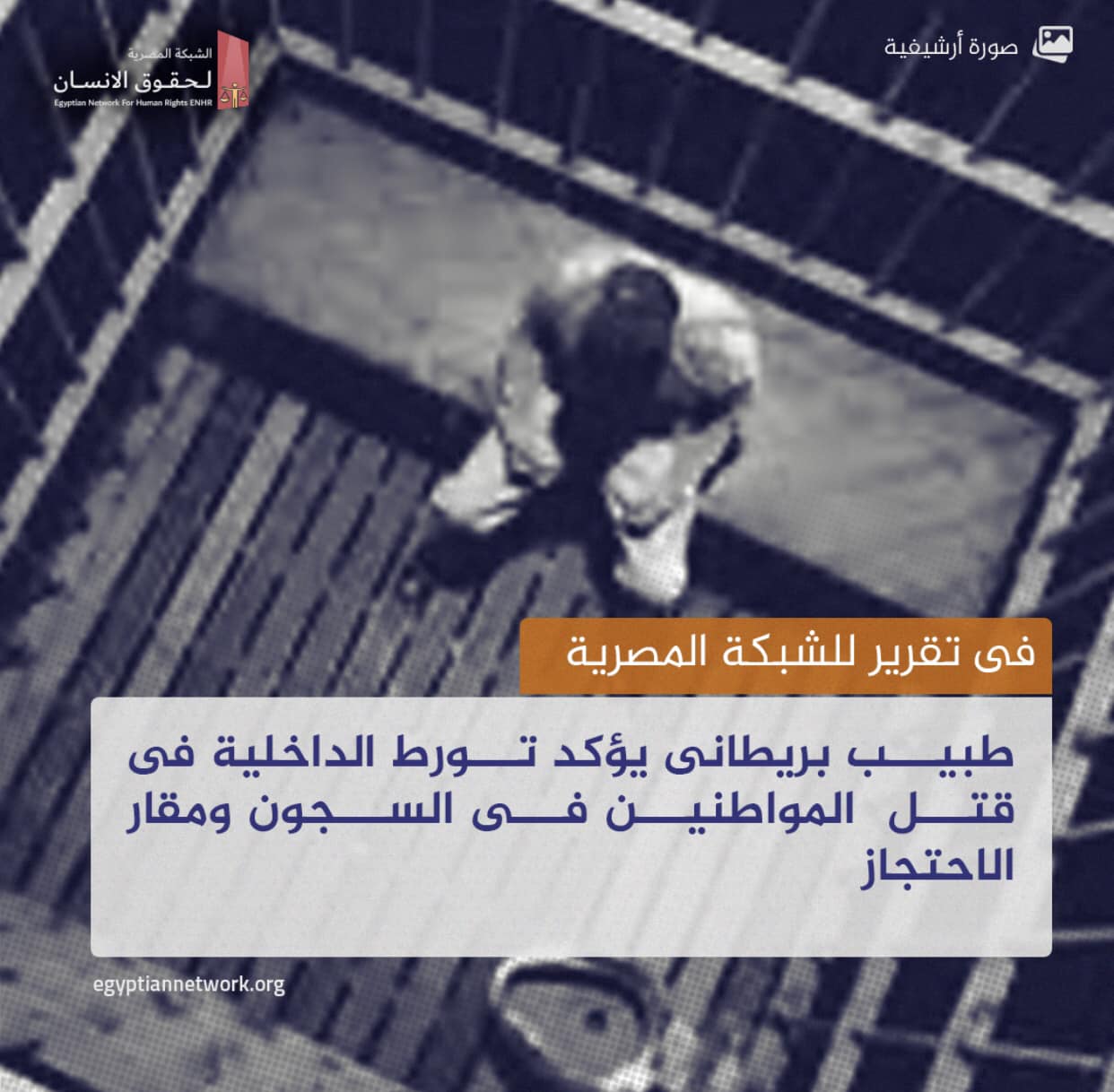 أكدت الشبكة المصرية لحقوق الإنسان ، أن ما دأبت عليه عناصر وزارة الداخلية بحكومة الانقلاب من انتهاكات جسيمة تنتهي بلفظ الموقوفين أنفاسهم الأخيرة، هي عمليات قتل مع سبق الإصرار والترصد، وتصفية جسدية يجري خلالها تعريض المواطنين لأبشع أنواع التعذيب النفسي والبدني على مدار ساعات وأيام وأسابيع، وهي وسائل ممنهجة وليست عارضة كما تدعي الداخلية في بعض تبريراتها.