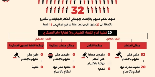 وفي مارس الماضي رصدت صدورأحكام بإعدام 23 مواطنا في 13 قضية ، فضلا عن إحالة أوراق 31 آخرين للمفتي لأخذ الرأي في إعدامهم في 20 قضية أخرى.