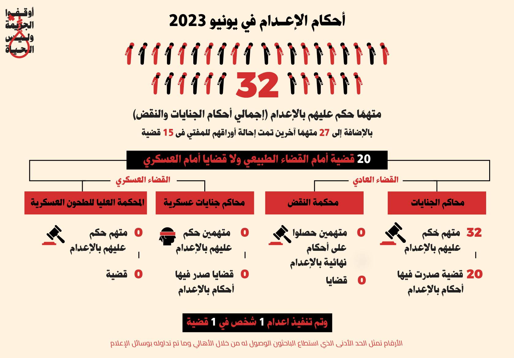 أصدرت "المبادرة المصرية للحقوق الشخصية" تقريرها الإحصائي الشهري ، بشأن عقوبة الإعدام في مصر، رصدت فيه صدور 32 حكما بالإعدام خلال يونيو الماضي 2023 ، إضافة لإحالة أوراق 27 مواطنا في 15 قضية إلى مفتي العسكر تمهيدا للحكم بإعدامهم.