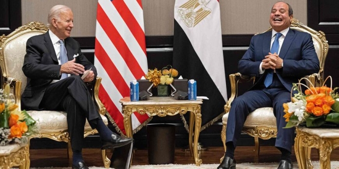 TOPSHOT - Egyptian President Abdel Fattah El-Sisi and his US counterpart Joe Biden hold a meeting on the sidelines of the COP27 summit, in Egypt's Red Sea resort city of Sharm el-Sheikh, on November 11, 2022. - Biden arrived at UN climate talks in Egypt today, armed with major domestic achievements against global warming but under pressure to do more for countries reeling from natural disasters (Photo by SAUL LOEB / AFP) (Photo by SAUL LOEB/AFP via Getty Images)