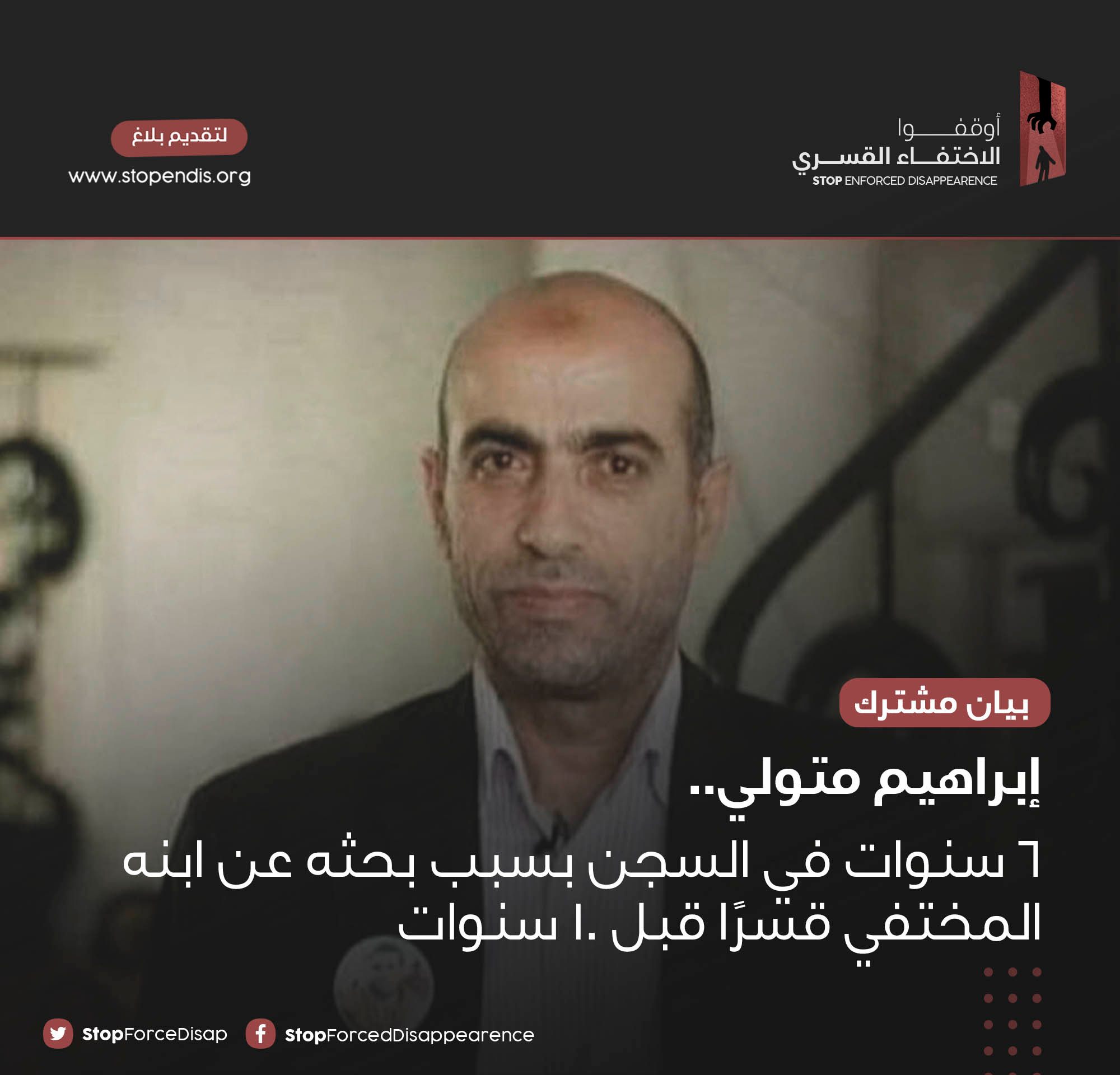 وطالبت المنظمات في بيان مشترك صادر عنها اليوم بالإفراج الفوري وغير المشروط عن إبراهيم متولي، والكشف عن مصير ابنه المختفي قبل 10 سنوات، ووضع حد لجريمة الإخفاء القسري في مصر وتقديم المسئولين عنها للمحاسبة.