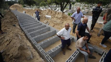 وأظهرت مقاطع مصوّرة نشرت عبر مواقع التواصل الاجتماعي تجهيز آلة بناء حفرة كبيرة في الأرض لدفن 100 شهيد في جوار بعضهم البعض بمدينة غزة بسبب تكدّس الجثامين في ثلاجات الموتى.