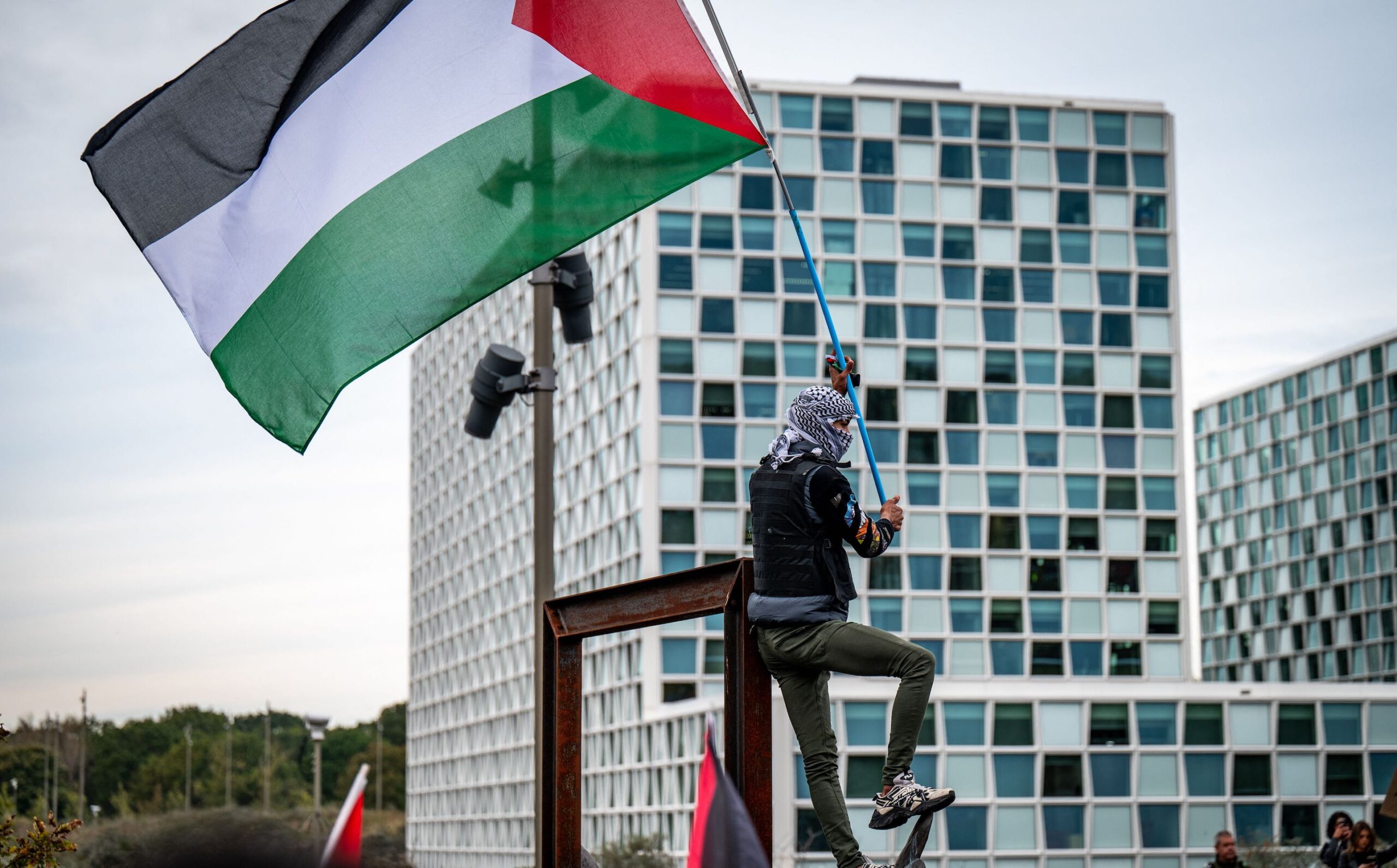 TOPSHOT - A protestor wearing a Palestinian Keffiyeh scarf takes part in a demonstration in solidarity with Palestinians in front of the International Criminal Court in the Hague on October 18, 2023, a day after the death of hundreds of people in a strike on a Gaza hospital. (Photo by Josh Walet / ANP / AFP) / Netherlands OUT (Photo by JOSH WALET/ANP/AFP via Getty Images)