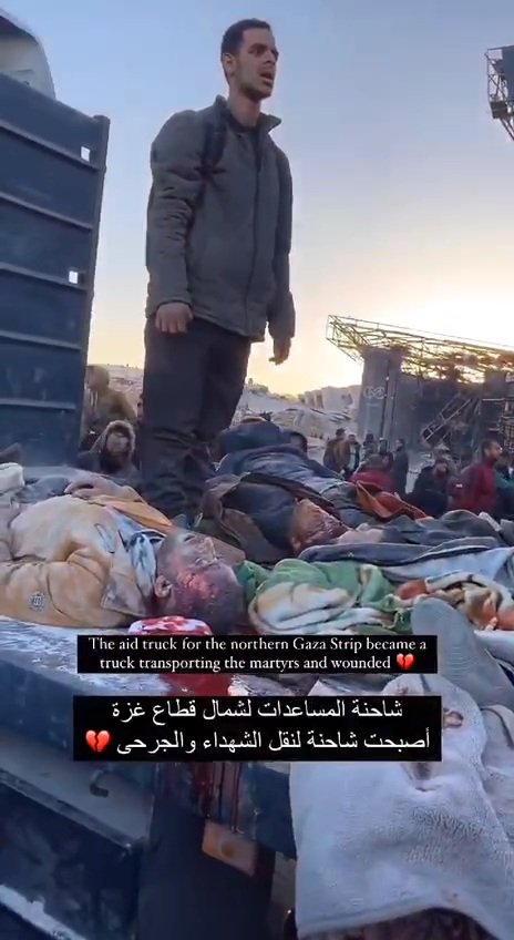 وقتل جيش الاحتلال عمدا بغارة جوية مئات الفلسطينيين تجمعوا للحصول على مساعدات غذائية (طحين غاليا) أعلنت دول عربية قرب إسقاطها في المكان، ثم أدعي الجيش الصهيوني أن “مئات الفلسطينيين اقتربوا من قواتنا أثناء تسلم مساعدات شمالي غزة وجنودنا ردوا بإطلاق النار”.. وأنه “يجري تحقيقا في الحادثة”.
