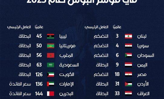 وتصدر لبنان قائمة الدول العربية، والترتيب الثالث عالميا، في الأكثر بؤسا مدفوعا بشكل أساسي بارتفاع معدل التضخم والتضخم كان أيضا العامل الأساسي لترتيب سوريا والسودان ومصر.