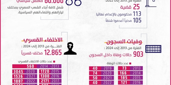ويتزامن تقرير المنظمة الحقوقية مع رسالة مسربة من سجن “بدر1” تفيد بإضراب مئات المعتقلين السياسيين عن الطعام، منذ مطلع الشهر الماضي، احتجاجا على تردي أوضاعهم وظروف احتجازهم.