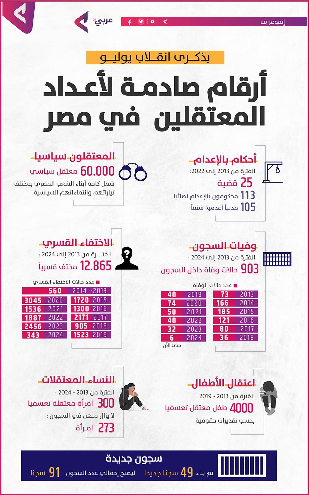 وثقت الشبكة المصرية لحقوق الإنسان، على مدار الأسابيع الماضية، في الذكرى الـ11 للانقلاب العسكري، وقوع العديد من الوفيات بين المحبوسين احتياطيا، خاصة في مراكز وأقسام الشرطة بمختلف المحافظات، كما أنها أشارت إلى تردي أوضاع المحتجزين التي تتفاقم بفعل التكدس الشديد، حيث تتجاوز نسبة التكدس في بعض الأماكن الـ300% من الطاقة الاستيعابية لغرف الحجز.