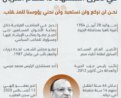 في ذكري استشهاد الدكتور عصام العريان في 13 أغسطس 2020، نائب رئيس حزب الحرية والعدالة، عضو مكتب الارشاد السابق في جماعة الإخوان المسلمين، والبرلماني المصري ومستشار رئيس الجمهورية ورفيق درب الرئيس الشهيد #محمد_مرسي رحمه الله قال حسن صالح المتحدث باسم جماعة الإخوان الملسمين إنه سياسي محنك وداعية رباني نطق بكلمة الحق وما ضيَّع و ما انتكس أمام أنواع الفتن، بحسب @mbs_salh.