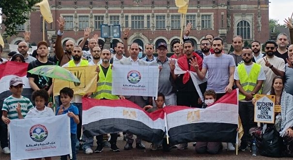 نظم أحرار رابعة العدوية وقفه شارك فيها مصريين هولنديين أمام محكمة العدل الدولية لاهاي لإحياء الذكري الحادية عشرة لمذبحة فُض رابعة والنهضة.