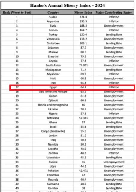 وحسب الترتيب التنازلي، كانت الدول العشر الأكثر بؤسًا في العالم في عام 2024، بحسب هانكي هي: السودان والأرجنتين وسوريا واليمن وتركيا وفنزويلا وزيمبابوي ولبنان وملاوي وإسواتيني.