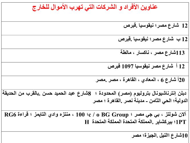 • موضحا أنه في إبريل 2011 سارع المجلس العسكري بتكوين ما يمسى باللجنة الوطنية لاسترداد الأموال (أو لمنع استراداد الأموال) برئاسة مساعد وزير العدل لشئون الكسب غير المشروع، ونبه على كل الدول عدم التعامل مع المجموعة الشعبية.