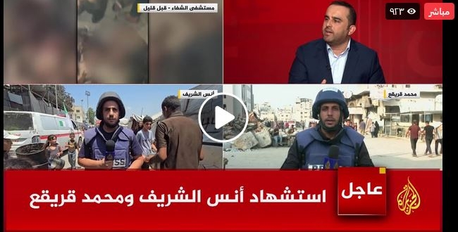 وأعلنت قناة الجزيرة عن استشهاد مراسليها أنس الشريف ومحمد قريقع، وذلك وفق ما أكد عليه مدير مجمع الشفاء الطبي.