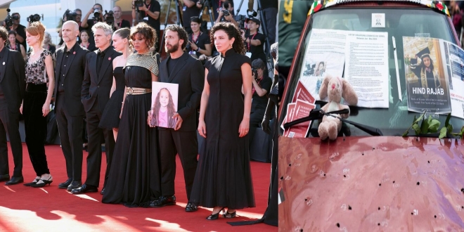 تابع عشرات الفنانين العالميين فيلم درامي بعنوان "صوت هند رجب" في مهرجان فينيسيا وهو فيلم يوثق الصرخات الأخيرة للطفلة الغزية قبل أن يقتلها قصف "إسرائيلي" كما ينافس الفيلم التونسي على "الأسد الذهبي" بدعم عالمي من براد بيت وخواكين فينيكس.