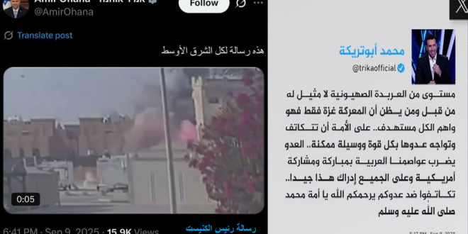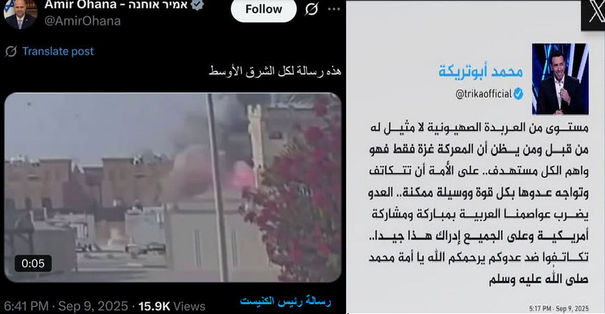 من جهته، كتب الباحث والصحفي أحمد عابدين متسائلاً: "ماذا سيحدث إذا تكرر ما جرى في الدوحة مرة أخرى ولكن في القاهرة؟". لافتاً إلى أن عشرات من قادة فصائل المقاومة الفلسطينية موجودون حالياً في مصر، إلى جانب وزير خارجية إيران.