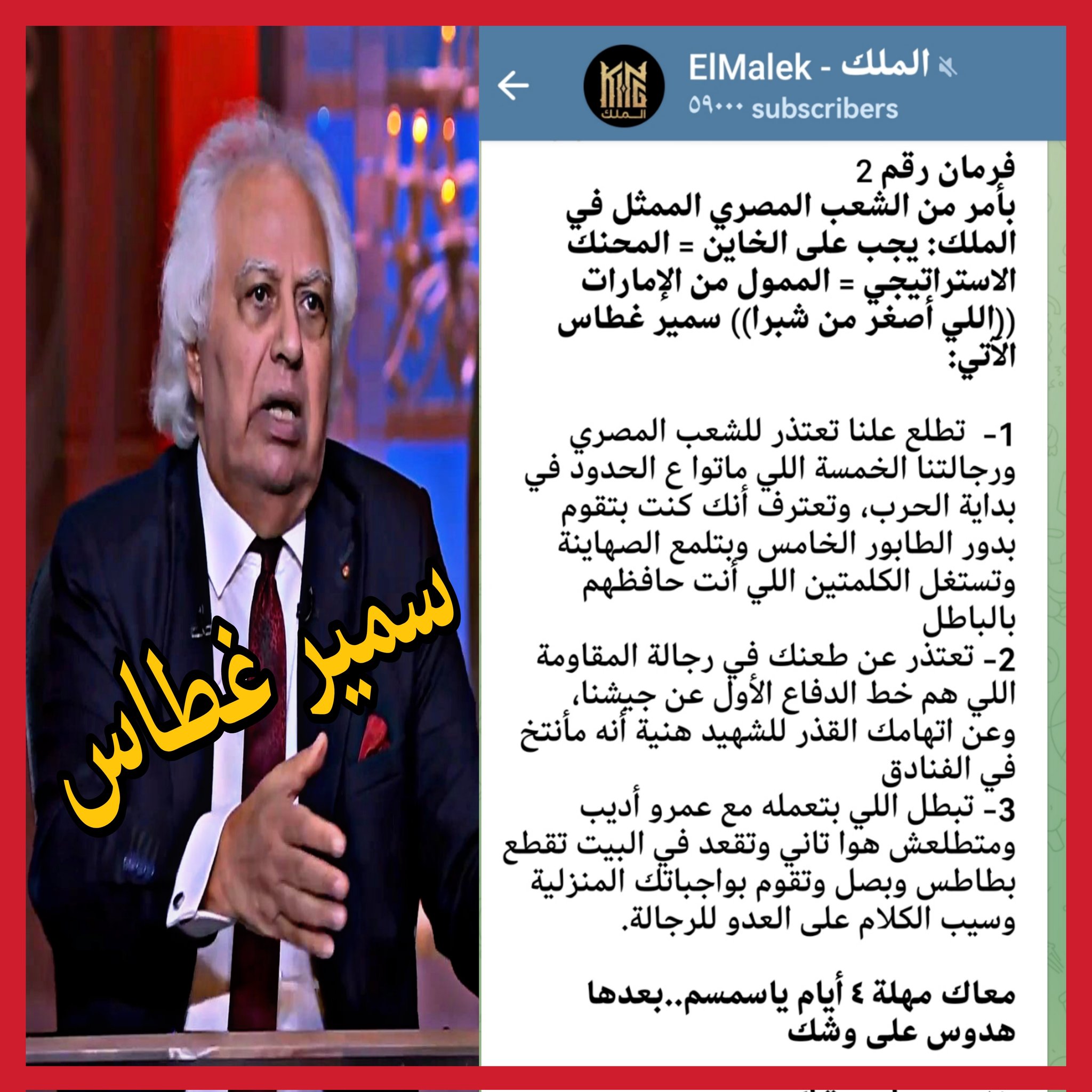 عادت منصات "ابن مصر" و"الملك"، ولكن هذه المرة بتهديد معلن للمحلل السياسي الانقلابي سمير غطاس، الذي دأب على ترديد نغمة أقرب للجان الإلكترونية على وسائل إعلام المتحدة، ولكن بعد خطأ محوري كشف فيه تداخل الأجهزة الأمنية الصهيونية "الشاباك" في تحديد من يدخل إلى قطاع غزة من عدمه وعلى قناة سعودية بظل عودة الملاسنات بين اللجان في مصر والسعودية، وبروز خلافات على السطح بين الجانبين مجددا، جاء دور الملك للتهديد بفضيحة جنسية ل"غطاس" أو "محمد حمزة" (غير المحدد بالنسبة للديانة أو الاسم الذي ربما يكون اسما جديدا) .