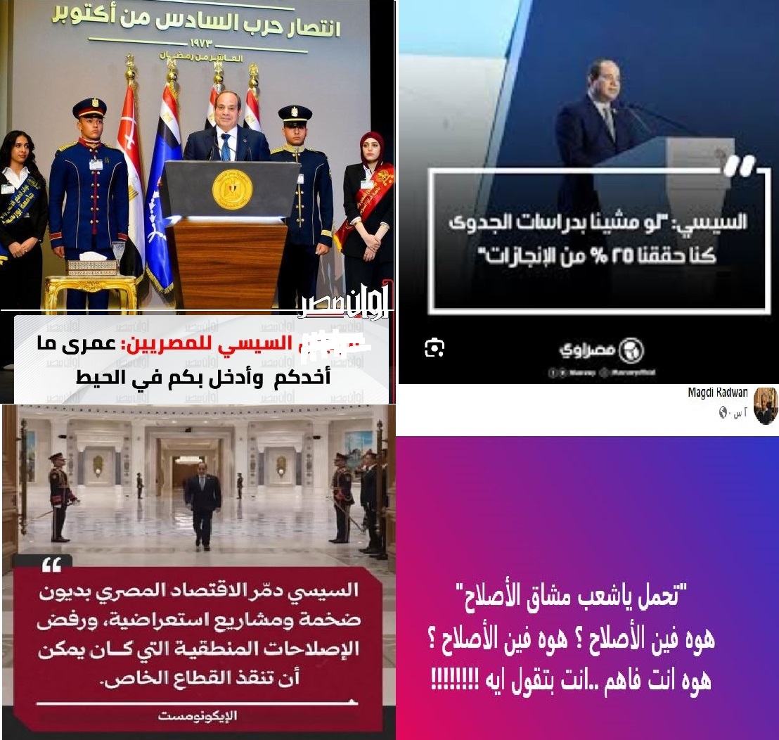 وأردف، "علشان أنا بحبكم بعمل اللي بعمله دا (الإصلاح الاقتصادي). عمري ما فكرت أبدا حتى في أصعب الأوقات أخدكم وادخل بيكم في الحيط. كل قرار بيتم دراسته بدل المرة 100". في حين سبق أن أكد أنه لا يعتمد دراسات الجدوى في مشاريعه و"انجازاته".