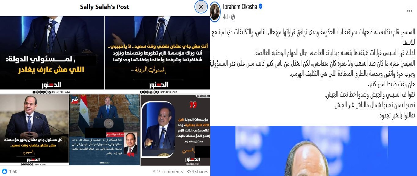 في تحليلها، تذهب سالي صلاح إلى أن المنشور الذي يقول: إن "السيسي و(تسميه بوظيفته) قرر أن يعمل بنفسه، لأن الحكومة فشلت، ليس ولاءً بل اعترافا ضمنيا بأن النظام فقد السيطرة على أدواته، فهي تؤكد أن الحكومة ليست ضحية، بل تعمل بتعليمات السيسي نفسه، وبالتالي فإن المسؤولية الأولى تقع على من يختار القيادات ويديرها، هذا التفكيك يضع المسؤولية مباشرة على رأس السلطة، لا على المؤسسات التنفيذية.