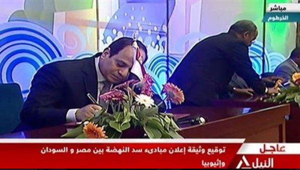 ومن أشد ما دل عليه البيان تجاهله اتفاق الخرطوم أو ما عرف ب"اتفاق المبادئ" الذي وقعه السيسي في العاصمة السودانية مع الرئيس السوداني السابق عمر البشير ورئيس وزراء اثيوبيا ديسالين وعنونت الصحف المحلية الموالية للإنقلاب ب"السيسي حلها"! وهو بالفعل (الاتفاق) الذي لا يستحق ثمن الحبر الذي ذيله السيسي بتوقيع تاريخي لبيع مصر مقابل "الكرسي" المغصوب.