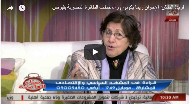 وزعمت الكاتبة الصحفية: "أن الإخوان ربما يكونوا وراء خطف الطائرة المصرية بقبرص"، مشددة على :"وجود من يتربص بمصر وضرورة تشديد الرقابة على المطارات".