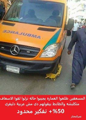وتُظهر الصورة المتداولة اليوم، سيارة إسعاف وضع لها كلبش أصفر أمام عمارة بها مريض، وكتب معها "المسعفون طلعوا العمارة يجيبوا حالة نزلوا لقوا الإسعاف متكلبشة والظابط بيقلهم :دي مش عربية دليفري؟!".