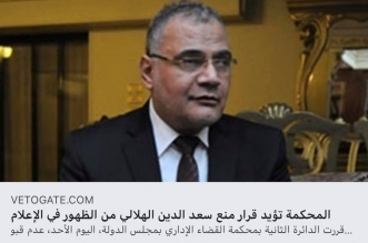 أيدت محكمة القضاء الإداري قرار منع سعد الدين الهلالي أحد أبرز شيوخ الانقلاب والأستاذ بجامعة الأزهر من الظهور في الإعلام إلا بموافقة من رئيس جامعة الأزهر، رغم أنه لم ...