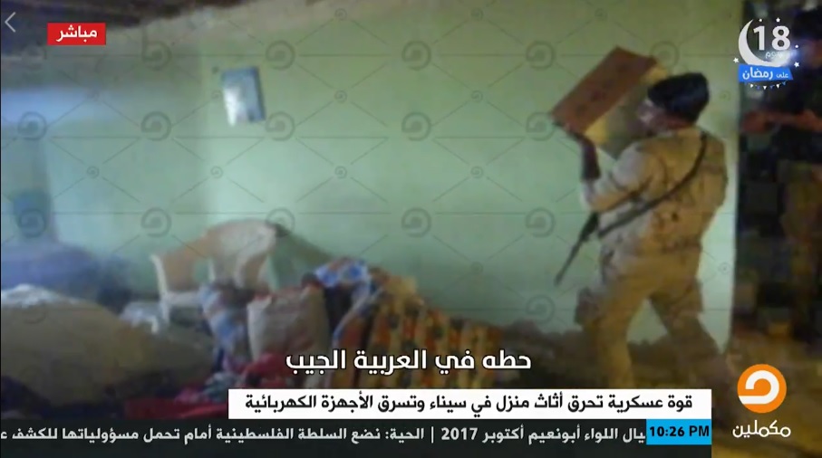 بثت قناة مكملين مقطع فيديو مسرب يكشف إضرام ضباط الجيش النار في بيت سيدة سيناوية بوحشية متناهية بعد سرقة الأجهزة الكهربائية. ويظهر الفيديو أفرادا من الجيش يستولون على ...
