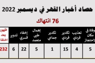 رصد "أرشيف حصاد القهر" لشهر ديسمبر الماضي 2022 الصادر عن "مركز النديم لمناهضة العنف والتعذيب" 76 انتهاكا متنوعا بينها 5 حالات وفاة داخل مقار الاحتجاز و5 حالة إهمال ...