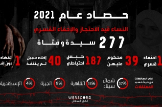 رصدت منظمة "نحن نسجل" الحقوقية في حصادها عن عام 2021 احتجاز وإخفاء 277 سيدة وفتاة، بينهن 187 قيد الحبس الاحتياطي و10 مختفيات قسريا و39 محكوم عليهن و40 سيدة حاصلة على إخلاء ...