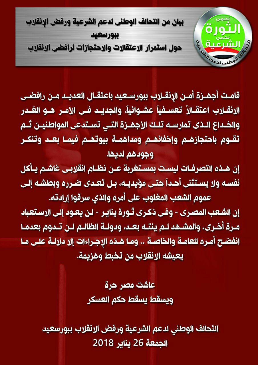 استنكر التحالف الوطني لدعم الشرعية ورفض الانقلاب ببورسعيد، اعتقال قوات أمن الانقلاب العشرات من أبناء المحافظة، مؤكدا أن ذلك ليس مستغربًا على نظام انقلابي يأكل نفسه ومؤيديه. وقال ...