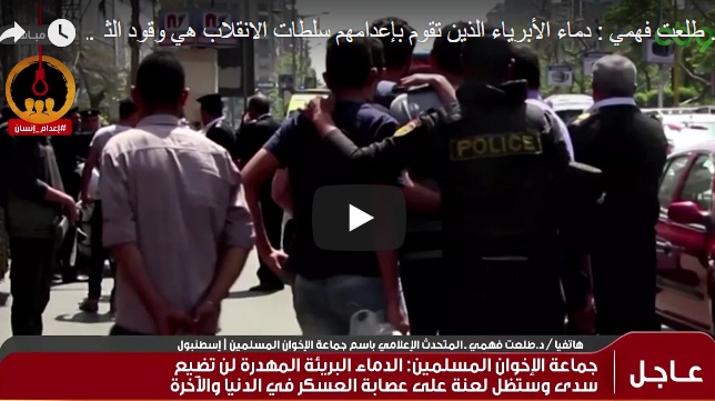 رامي ربيع قال الدكتور طلعت فهمي، المتحدث الإعلامي باسم جماعة الإخوان المسلمين، إن دماء الأبرياء الذين تقوم بإعدامهم سلطات الانقلاب، هي وقود الثورة القادمة في مصر. وأضاف فهمي- ...
