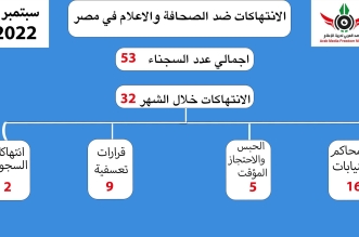 32 انتهاكا لحرية الإعلام خلال سبتمبر الماضي واستمرار حبس 53 صحفيا وإعلاميا