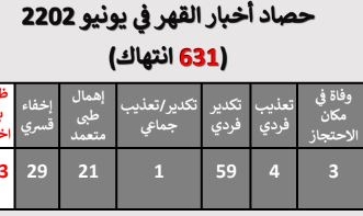رصد أرشيف القهر لشهر يونية المنقضي 2022 الصادر عن مركز النديم لمناهضة العنف والتعذيب631 انتهاكا متنوعا ، وظهور 103 من المختفين قسريا لفترات متفاوتة أثناء عرضهم على نيابة أمن الانقلاب ...