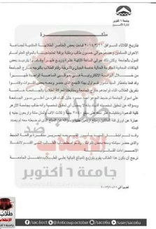 نشرت حركة طلاب ضد الانقلاب بجامعة "6 أكتوبر" مستندات قالت إنها تثبت تورط إدارة الجامعة في إبلاغ الأمن الوطني ببيانات الطلاب. قالت الحركة -في بيان لها- إنها تمتلك ...