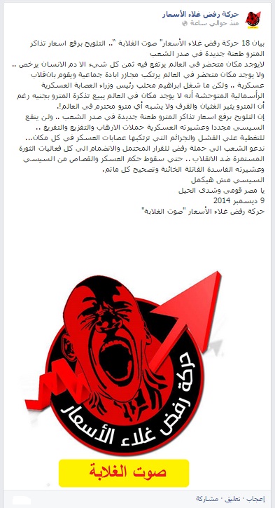 قالت حركة "رفض غلاء الأسعار": إن التلويح برفع أسعار تذاكر المترو طعنة جديدة في صدر الشعب؛ حيث لا يوجد مكان متحضر في العالم يرتفع فيه ثمن كل شيء ...