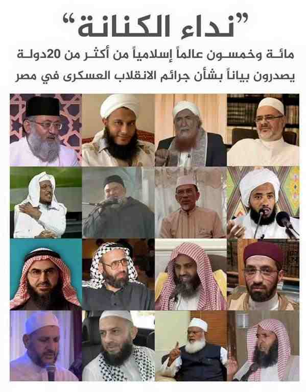 رحبت جماعة الإخوان المسلمين ببيان نداء الكنانة، واعتبرته "واجب الفتوى الشرعية في مواجهة جرائم العسكر الانقلابيين، وآخرها أحكام الإعدام بحق الرئيس الشرعي د. محمد مرسي ومئات الأبرياء من ...