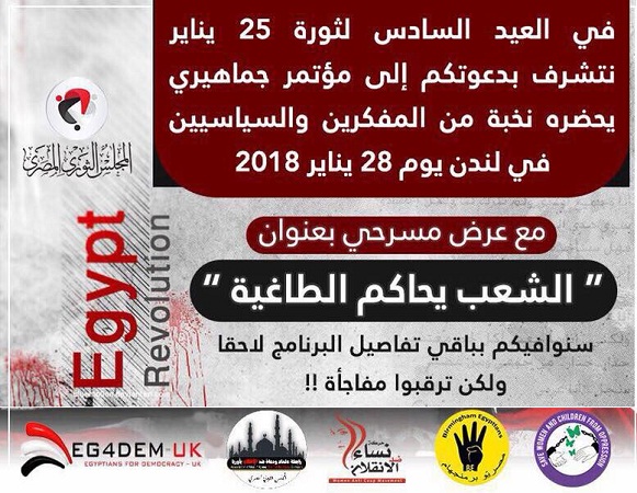 دعا المجلس الثوري المصري والكيانات الثورية بالمملكة المتحدة، لإحياء ذكرى ثورة يناير، التي سيتم عقدها يوم الأحد القادم ٢٨ يناير ٢٠١٨، فى العاصمة البريطانية لندن، بالتزامن مع الذكرى ...