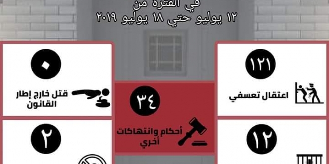 وخلال الأسبوع الأول من الشهر الجارى منذ يوم 28 يونيو حتى 4 يوليو 2019، وثقت المنظمة 227 انتهاكًا لحقوق الإنسان، تنوعت بين 172 حالة اعتقال تعسفي، و23 حالة إخفاء قسري، وحالة واحدة بالقتل خارج إطار القانون، وحالة واحدة بالإهمال الطبي بالسجون، و30 حالة محاكمات وانتهاكات أخرى.