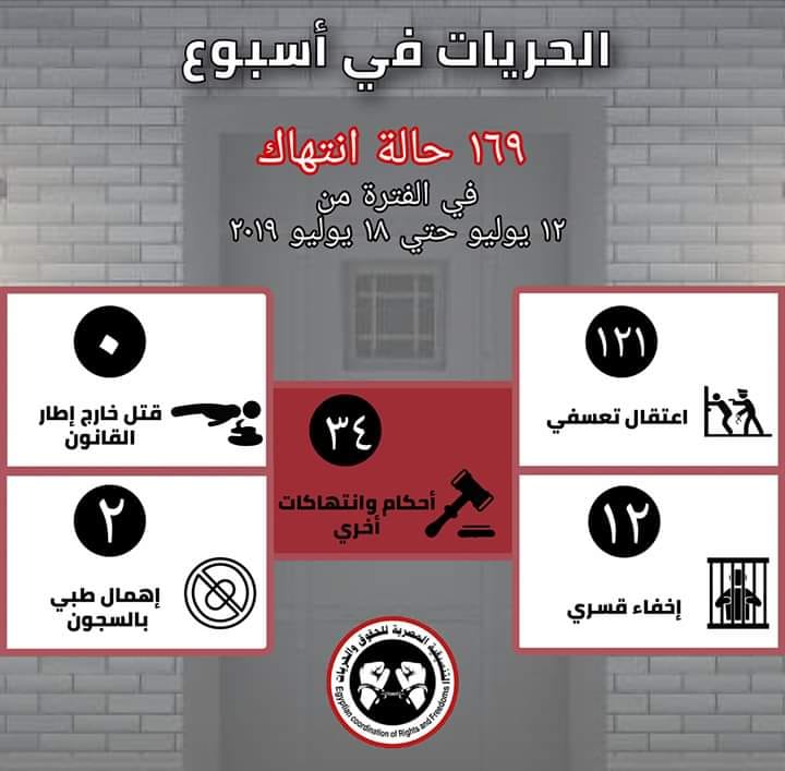 ورصدت "التنسيقية المصرية للحقوق والحريات" في حصادها الأسبوعي عن الفترة من يوم 12 يوليو حتى 18 يوليو 2019، 169 حالة انتهاك لحقوق الإنسان.