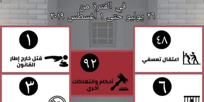 رصدت "التنسيقية المصرية للحقوق والحريات"، خلال الأسبوع الماضي منذ يوم 26 يوليو حتى 1 أغسطس 2019، 150 حالة انتهاك لحقوق الإنسان في مصر، تنوعت بين 48 حالة اعتقال تعسفي، و6 حالات إخفاء قسري، وحالة واحدة من القتل خارج إطار القانون، و3 حالات من الإهمال الطبي بالسجون، و92 حالة محاكمات وانتهاكات أخرى.