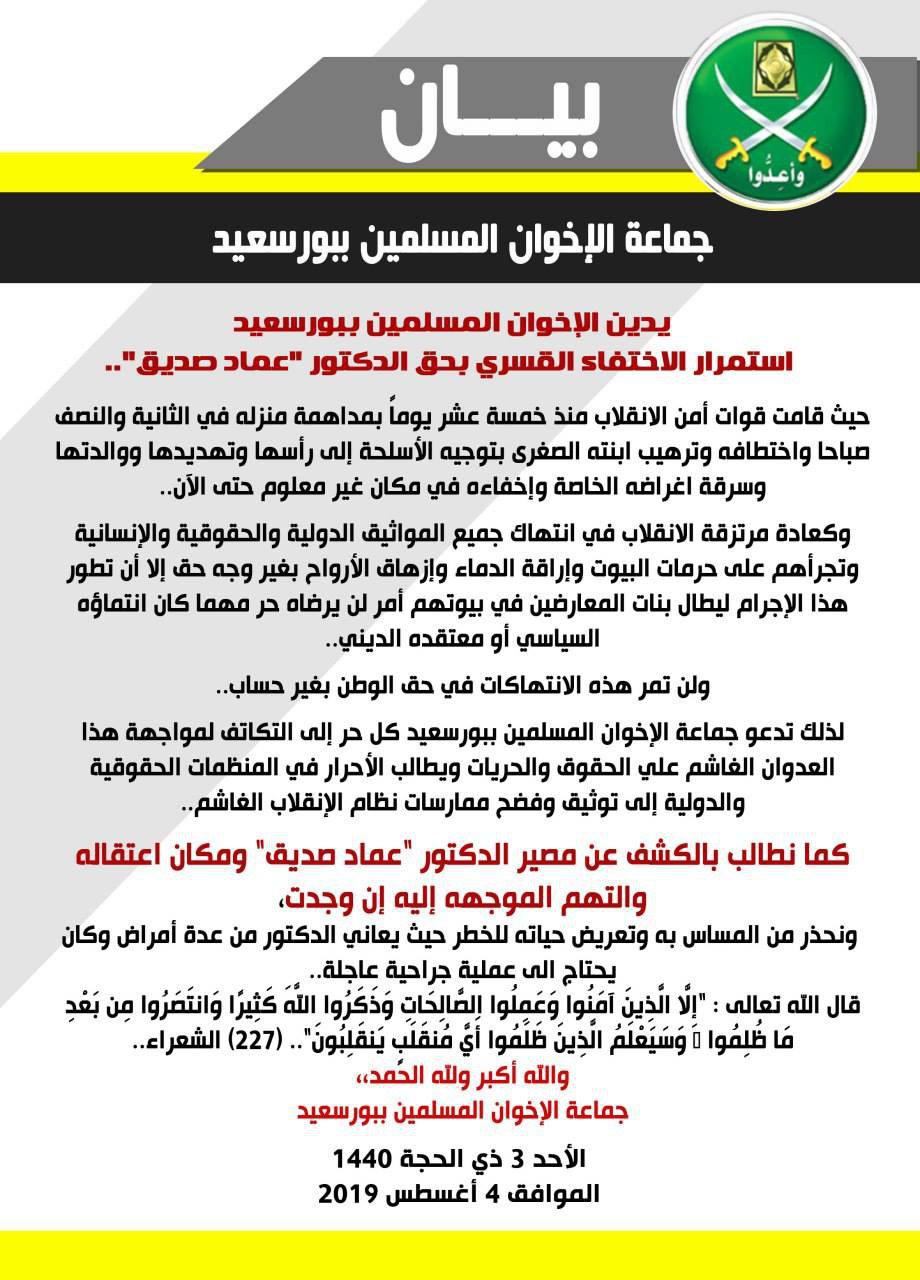 وطالبت الجماعة بالكشف عن مصير الدكتور "عماد صديق" ومكان اعتقاله، محذرة من المساس به وتعريض حياته للخطر.