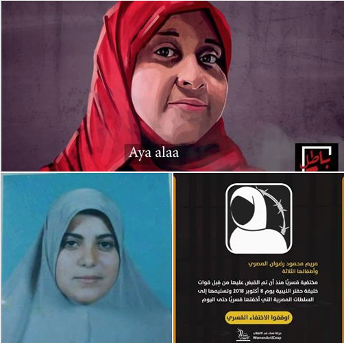 وأعربت عن أسفها لاستمرار الإخفاء القسري منذ أكثر من عشرة أشهر للسيدة "مريم رضوان" وأطفالها الثلاثة، حيث تم القبض عليها من قِبل قوات خليفة حفتر الليبية، يوم 8 أكتوبر 2018، وتسليمها إلى سلطات الانقلاب فى مصر التي أخفتها قسريًا حتى اليوم.