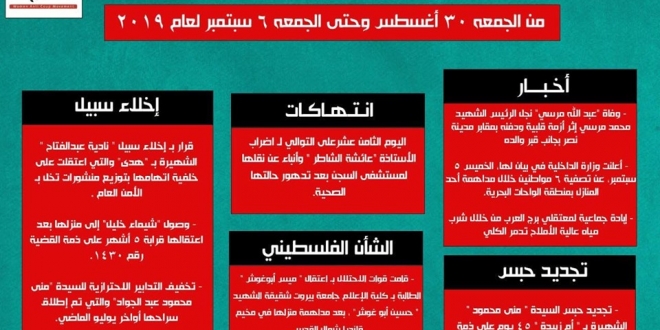 أيضا أشار الحصاد إلى وصول “شيماء خليل” إلى منزلها بعد اعتقالها قرابة 5 أشهر، على ذمة القضية الهزلية رقم 1430، وتخفيف التدابير الاحترازية للسيدة “منى محمود عبد الجواد”، والتي تم إطلاق سراحها أواخر يوليو الماضي.